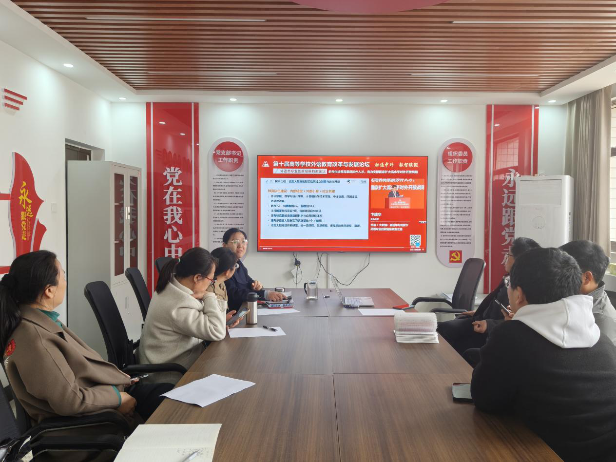 3月26日下午,商务英语、翻译专业全体教师分别集中学习第十届高等学校外语教育改革与发展论坛内容,重点围绕青岛大学卞建华教授所作的《外语+大数据:融通中外背景下英语专业的数智化转型之路》专题讲座展开深入研讨。讲座中,青岛大学外国语学院立足时代发展,在人才培养方案修订、课程体系重构、人才培养质量提升及教师成长等方面进行了系统探索,取得了一系列改革成果。特别是在语言大数据创新实验班的建设上进行的积极探索和显著成效,给与会教师留下深刻印象。学习结束后,两个教研室围绕英语专业学科转型发展展开交流研讨,一致认为在新形势下需重点关注两个方向:一是强化语言服务意识,外语教育要主动对接国家战略需求,服务“四新”建设,聚焦国际传播人才和跨境电商等应用型人才培养,充分发挥语言工具性功能,讲好中国故事,推动中华优秀传统文化对外传播,助力外贸高质量发展,服务地方经济社会建设;二是走稳“外语+专业”的跨学科融合发展之路,着力培养具有家国情怀、全球视野和专业本领的复合型应用型人才。