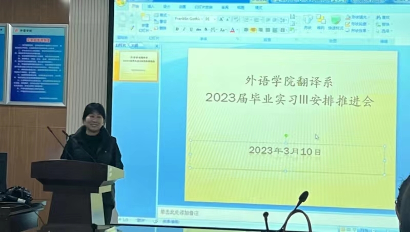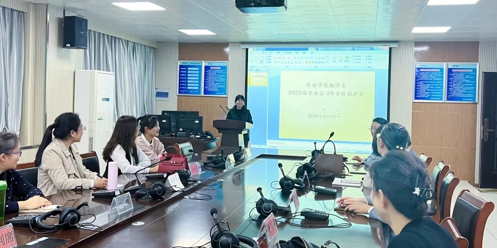 3月10日,bv1946伟德翻译系全体教师在智园楼同声传译教室召开2023届毕业实习III工作推进会,翻译系主任杨群艳主持会议。