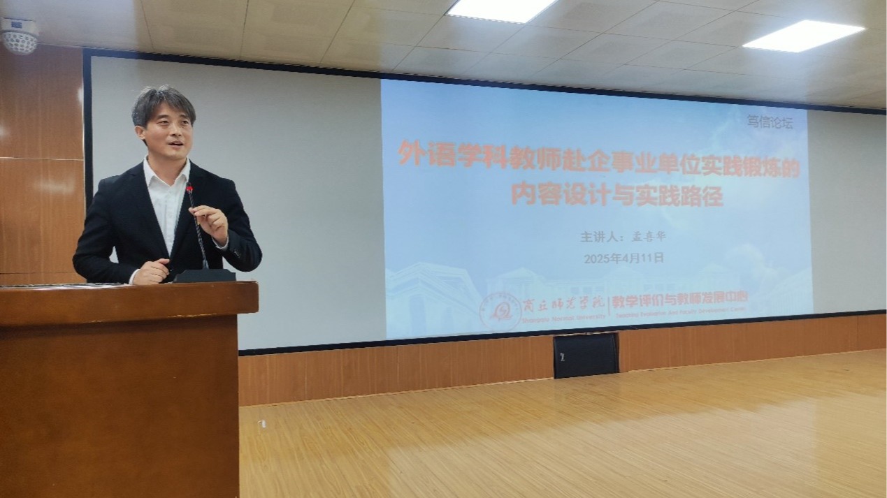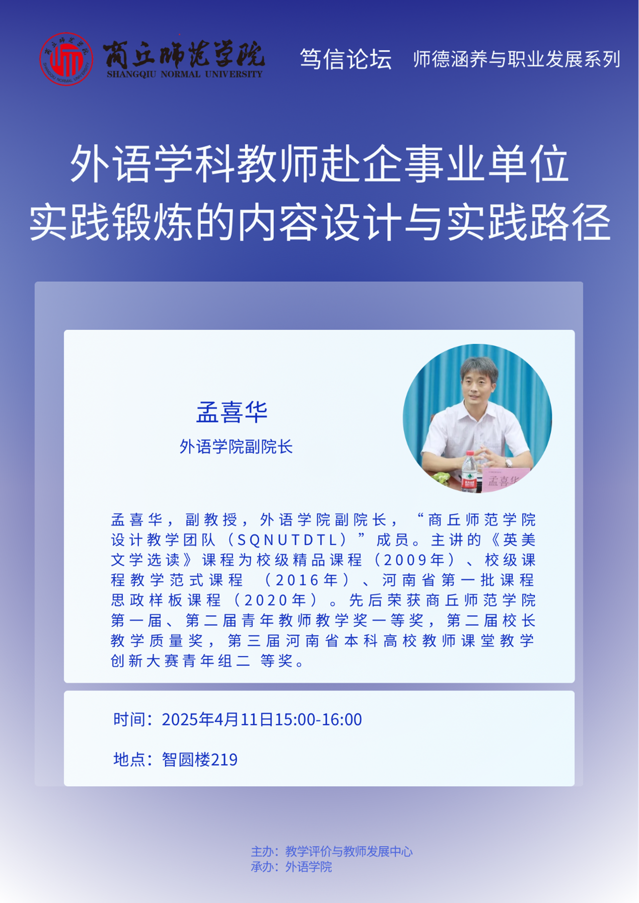 4月11日,由公司教学评价与教师发展中心主办、bv1946伟德承办的“笃信论坛”在公司梁园校区智圆楼219多功能报告厅举行,bv1946伟德副经理孟喜华作了题为《外语学科教师赴企事业单位实践锻炼的内容设计与实践路径》的专题讲座,bv1946伟德全体教师参加了本次论坛。
