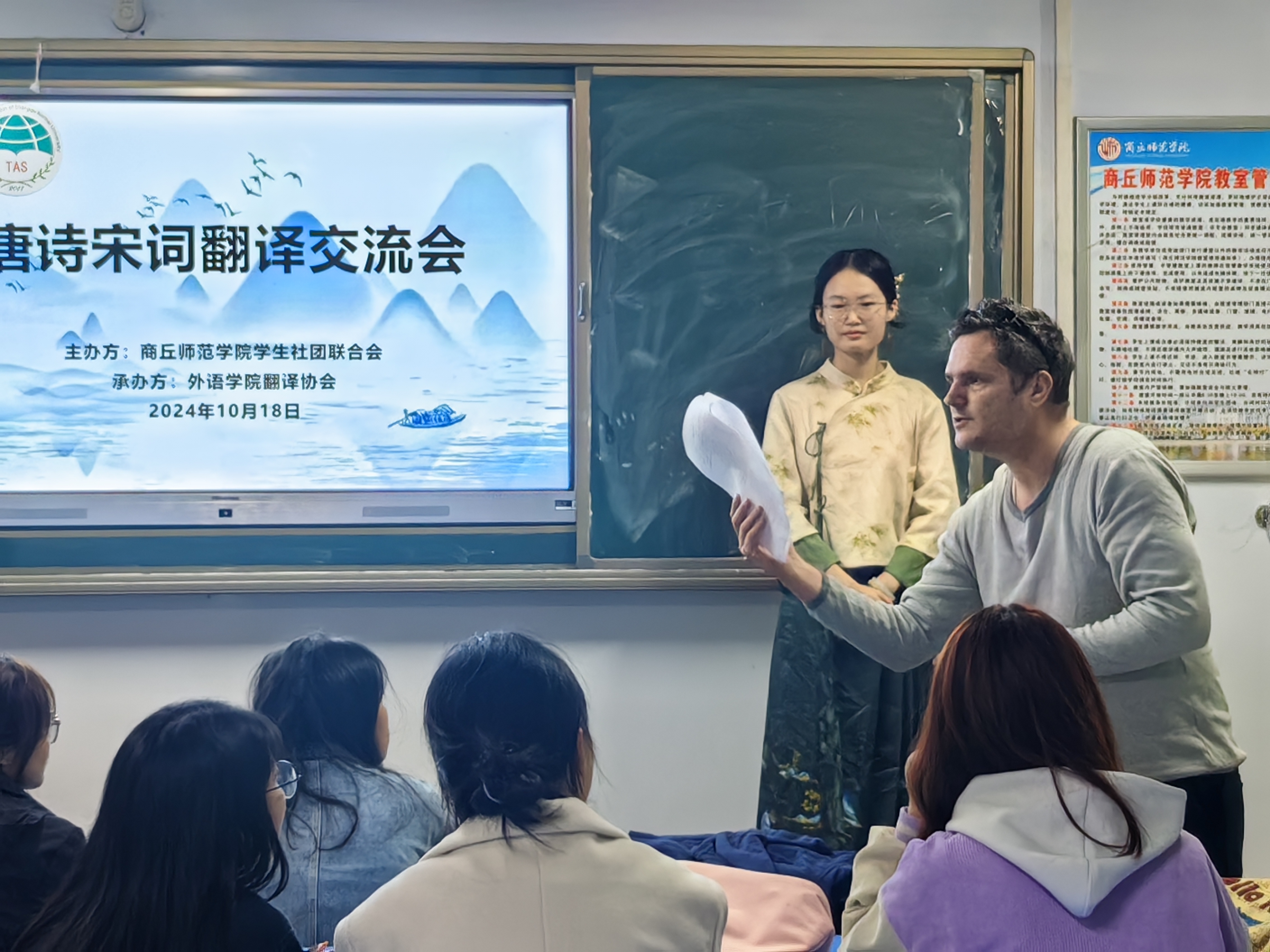 此次交流会邀请到了外籍教师Mark担任现场指导,活动内容是同学们根据自己的理解分别将两首唐诗和两首宋词翻译成英文,并进行现场展示和分享交流,体会每一种语言带来的韵律美和意境美。活动现场气氛热烈,同学们纷纷分享自己在翻译过程中的感受与体会,有的从文化差异的角度出发,阐述如何在翻译中准确传达诗词的意境;有的则通过具体的案例分析,展示了不同翻译方法所带来的不同效果。大家精彩的发言赢得了现场阵阵掌声,也启发了对于文化传承的思考和共鸣。