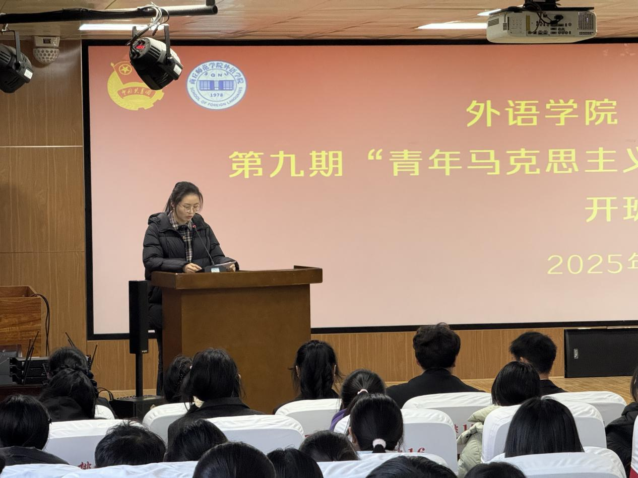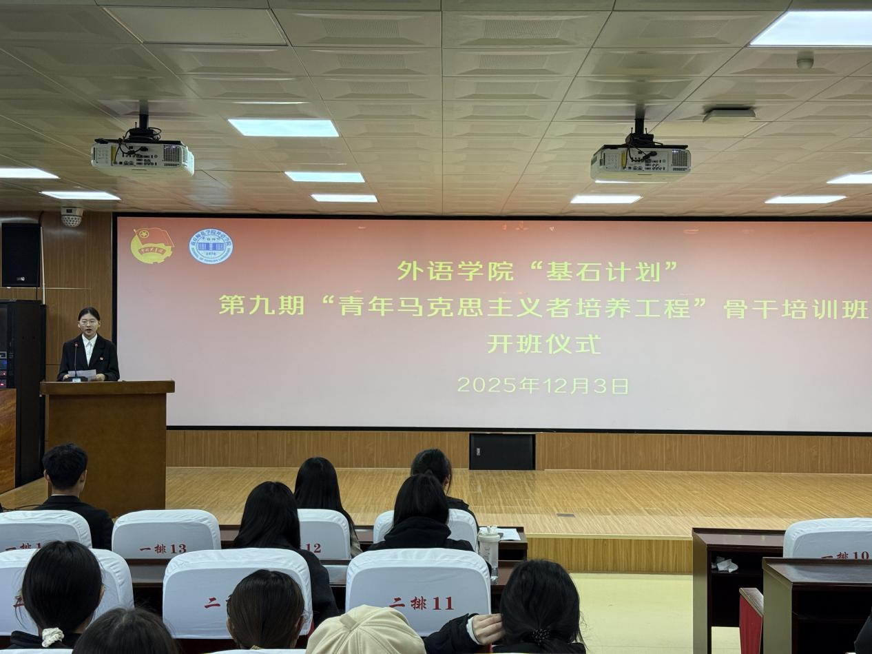 大会在激昂的国歌声中拉开帷幕,首先,孙颖宣读了《bv1946伟德“基石计划”第九期“青年马克思主义者”骨干培训班的实施方案》,明确了本期培训的目标任务和实施安排,要求学员们深刻领会青年马克思主义者培养工程的时代意义,自觉完成各项培训任务,通过系统学习提升政治素养、强化使命担当,努力成长为具有坚定马克思主义信仰的新时代青年骨干。随后,第八期培训班学员代表、bv1946伟德团委组织部部长潘怡辰发言。她结合自身培训经历,分享了在培训班中学习成长的收获与感悟,鼓励新学员珍惜机会、潜心学习、锤炼品格。接着,本期培训班学员代表、英语25-4班团支书要蕊发言。她表示,要在此次培训中系统学习马克思主义理论,筑牢信仰之基、提升政治素养、增强实践能力,努力成长为可堪大用的青年骨干。最后,王頔做总结讲话,她强调“青马工程”是培育青年政治骨干的关键载体,全体学员要珍惜学习机会,深化理论武装,筑牢信仰根基;要突出外语学科优势,努力成长为兼具家国情怀与国际视野的时代新人;要坚持学以致用,将培训成果转化为服务国家发展的实际行动,矢志不渝地担当起民族复兴大任。