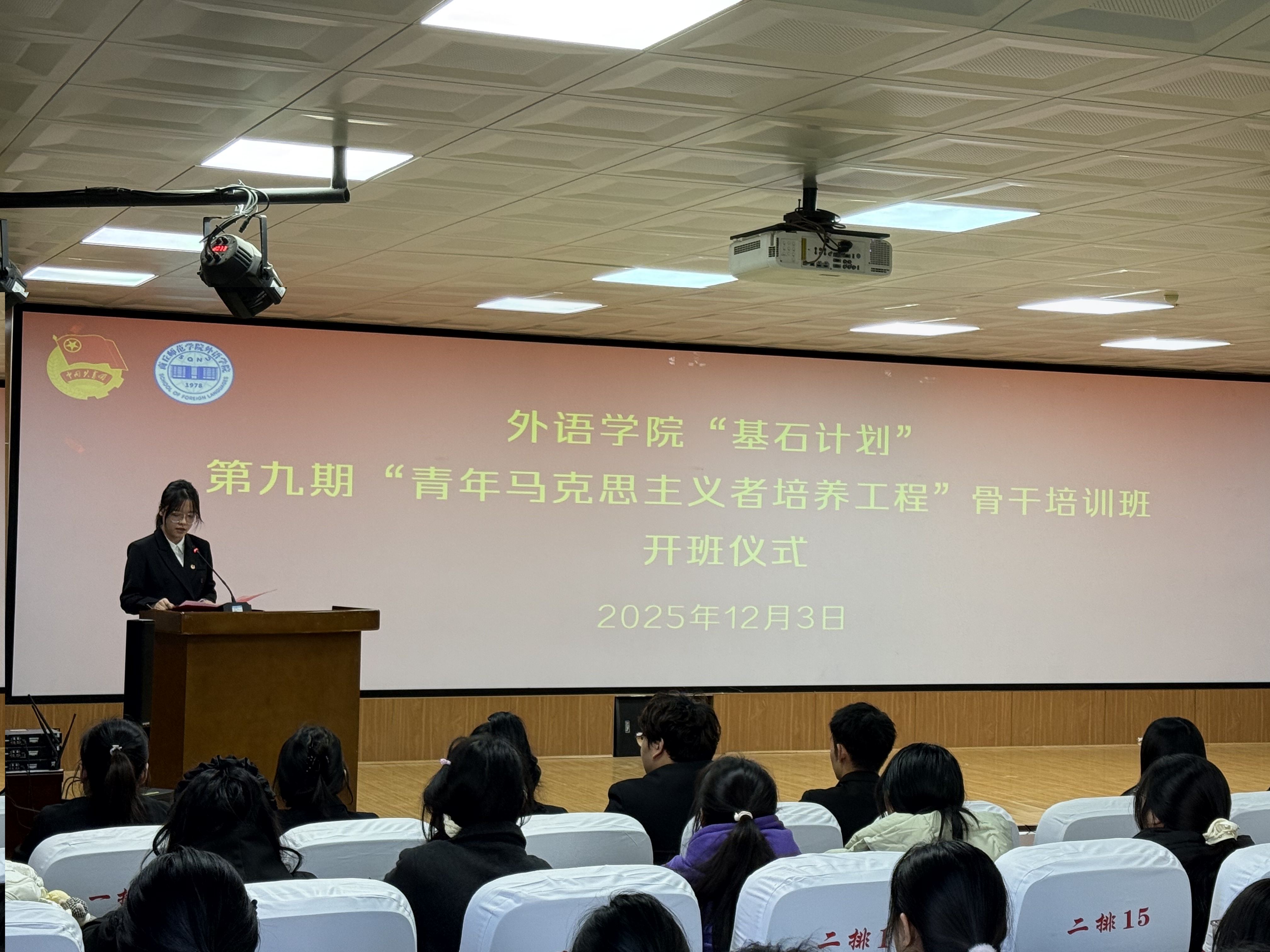 为深入学习贯彻习近平新时代中国特色社会主义思想和党的二十届四中全会精神,进一步加强“青年马克思主义者培养工程”建设,着力培养并输送一批信仰坚定、能力突出、素质优良、作风过硬的青年政治骨干,bv1946伟德团委于12月3日在智圆楼219多功能厅举行bv1946伟德“基石计划”第九期“青年马克思主义者”骨干培训班开班仪式。公司党委副书记王頔、团委负责人孙颖、培训班全体学员参加,仪式由团委副书记刘婷主持。
