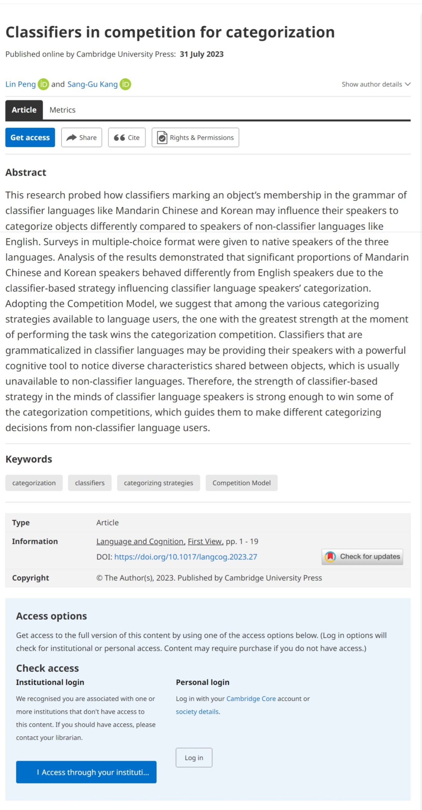 近日,bv1946伟德彭琳博士以第一作者身份在国际期刊Language and Cognition上发表了题为“Classifiers in competition for categorization”的高水平学术论文。该论文基于前人研究成果,创新性地构建了中、英、韩三种语言的量词竞争模型,并采用实证研究方法,探讨了量词的结构、事物分类的形式以及量词对事物分类带来的影响等语言学因素对二语习得和母语使用者的影响。
