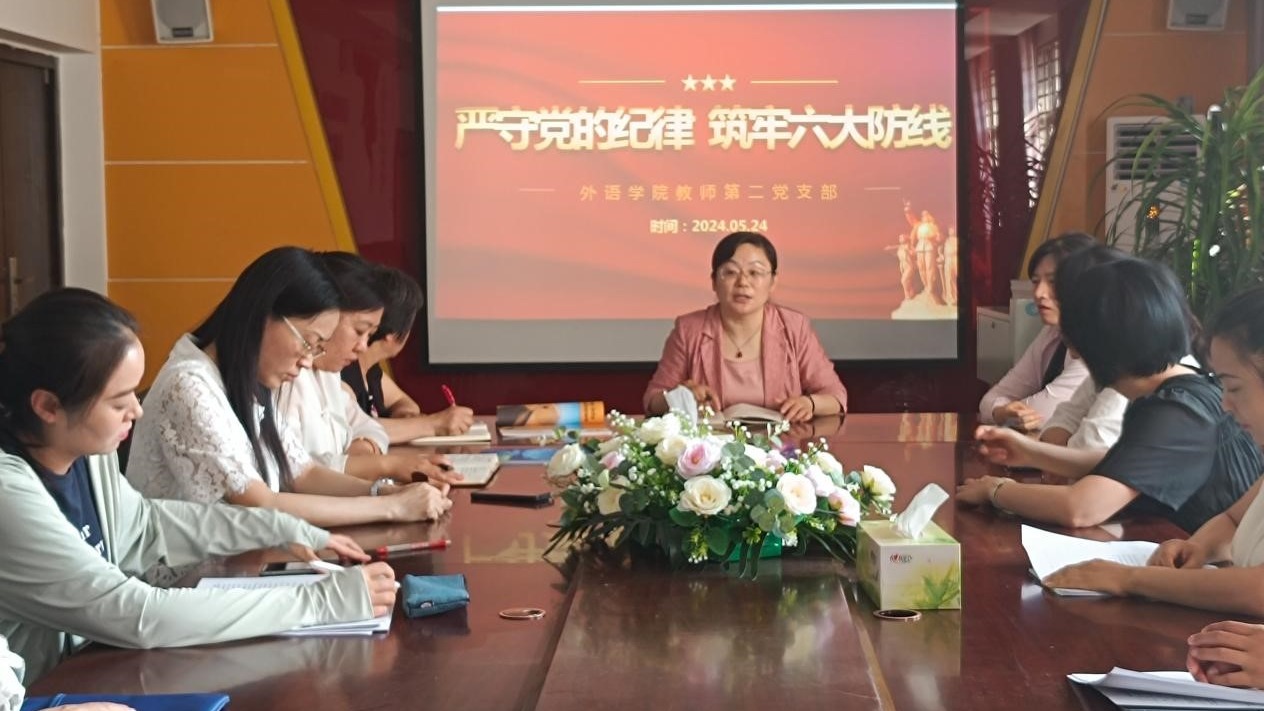 为进一步深化对加强党的纪律建设重要性的认识,根据公司党委《关于在全公司党员中深入开展党纪学习教育的实施方案》的文件精神,5月24日下午,bv1946伟德教师第二党支部在应天楼214会议室召开会议,支部书记刘敏为党员同志们上了一堂题为“严守党的纪律 筑牢六大防线”的专题党课,所有教师党员参加了本次党课学习会。