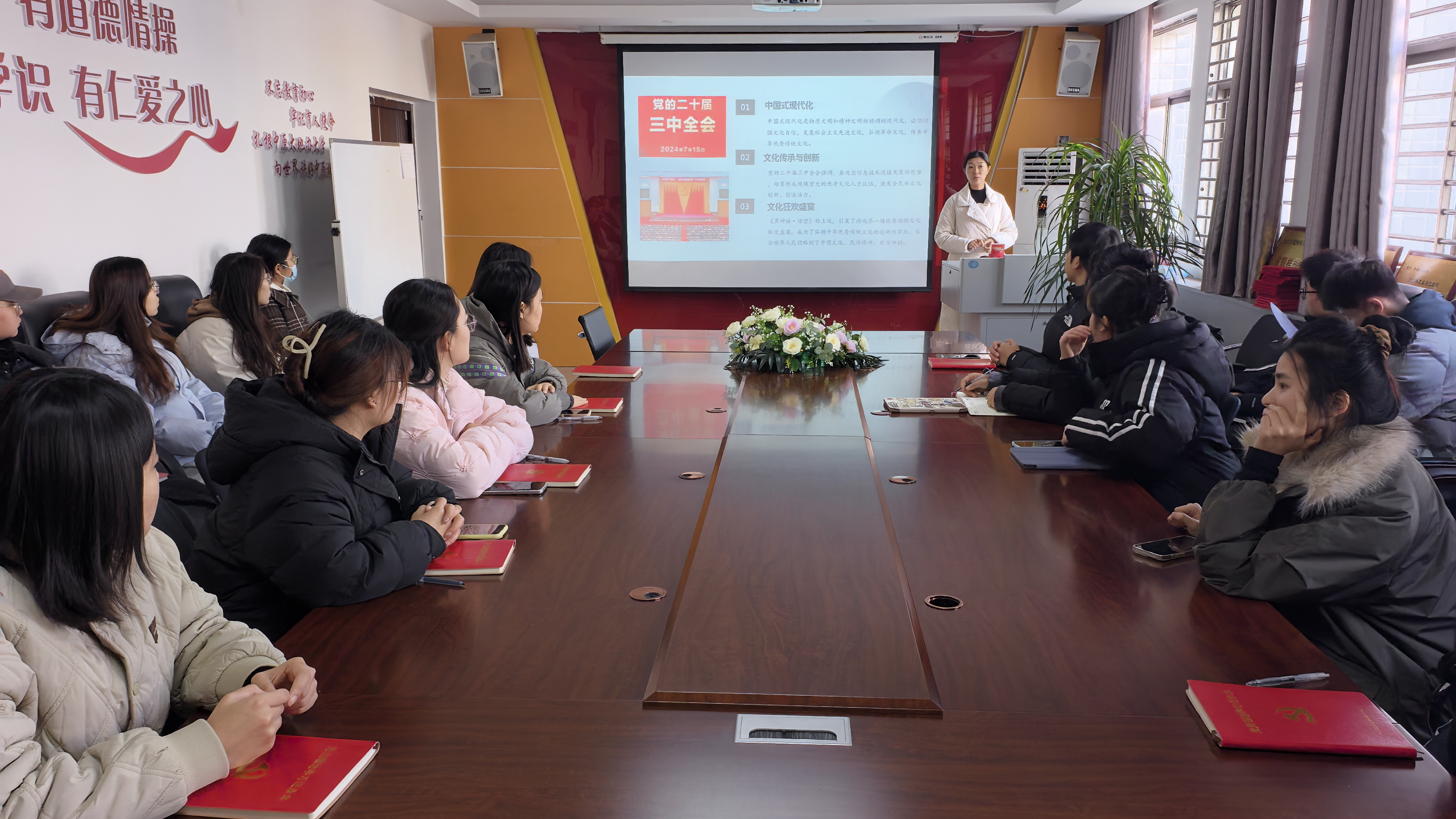 赵蕊首先从党的二十届三中全会讲起,并结合党的十一届三中全会,阐述了中国式现代化对增强文化自信的重要作用。随后,以文化自信为切入点,深入剖析了今年暑假爆火的国产游戏“黑神话・悟空”,指出其文化背景、创新点、魅力与吸引力等方面均彰显了中国特色社会主义文化的先进性。她还讲到以《流浪地球》为代表的中国科幻电影,强调其在推动中华优秀传统文化走向世界,激发全球对中华文化认同赞美方面起到积极作用。