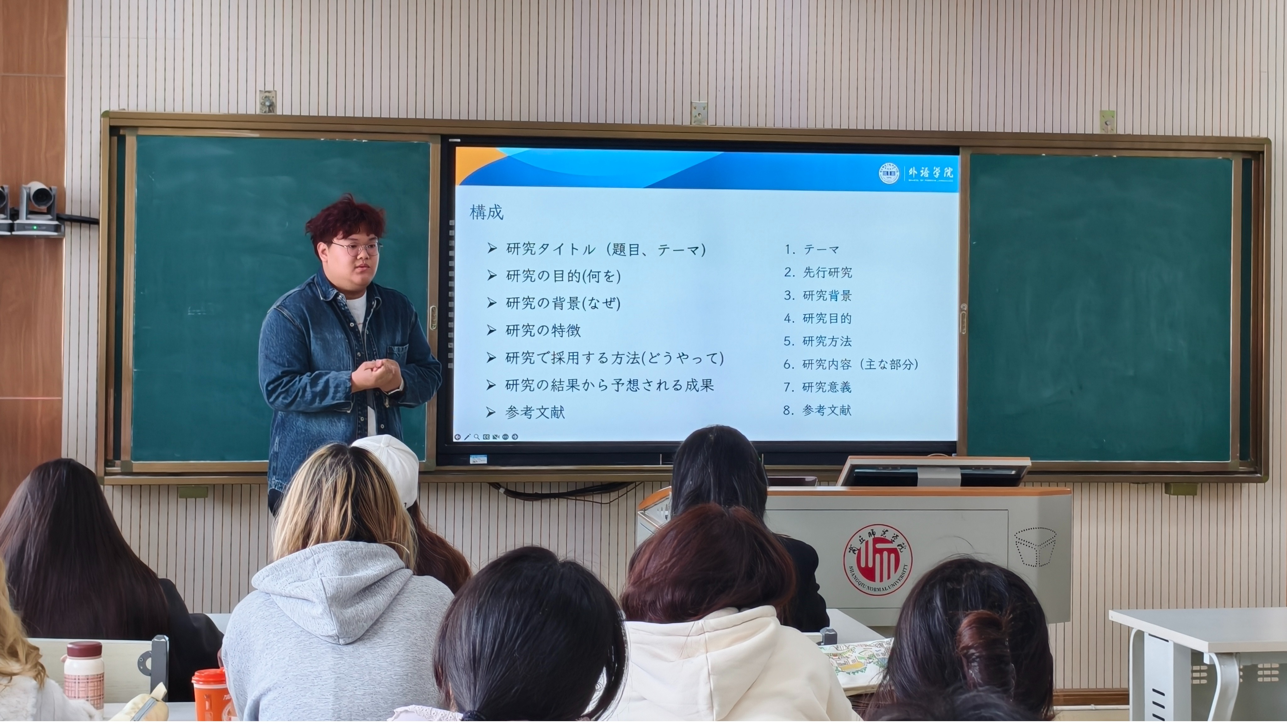 分享会上,王禹博同学围绕研究计划书的核心构成,结合自身学术实践经验与日语专业学科特色,从选题确立、研究目的与背景阐释、研究方法选择、参考文献梳理等关键板块,进行了条理清晰、重点突出的细致拆解。他通过具体案例演示,生动讲解了如何精准明确研究问题、搭建严谨的学术逻辑脉络,同时针对员工在撰写过程中易出现的选题模糊、逻辑混乱、参考文献不规范等常见误区,逐一给出规避方法与改进建议,干货满满、指导性强。