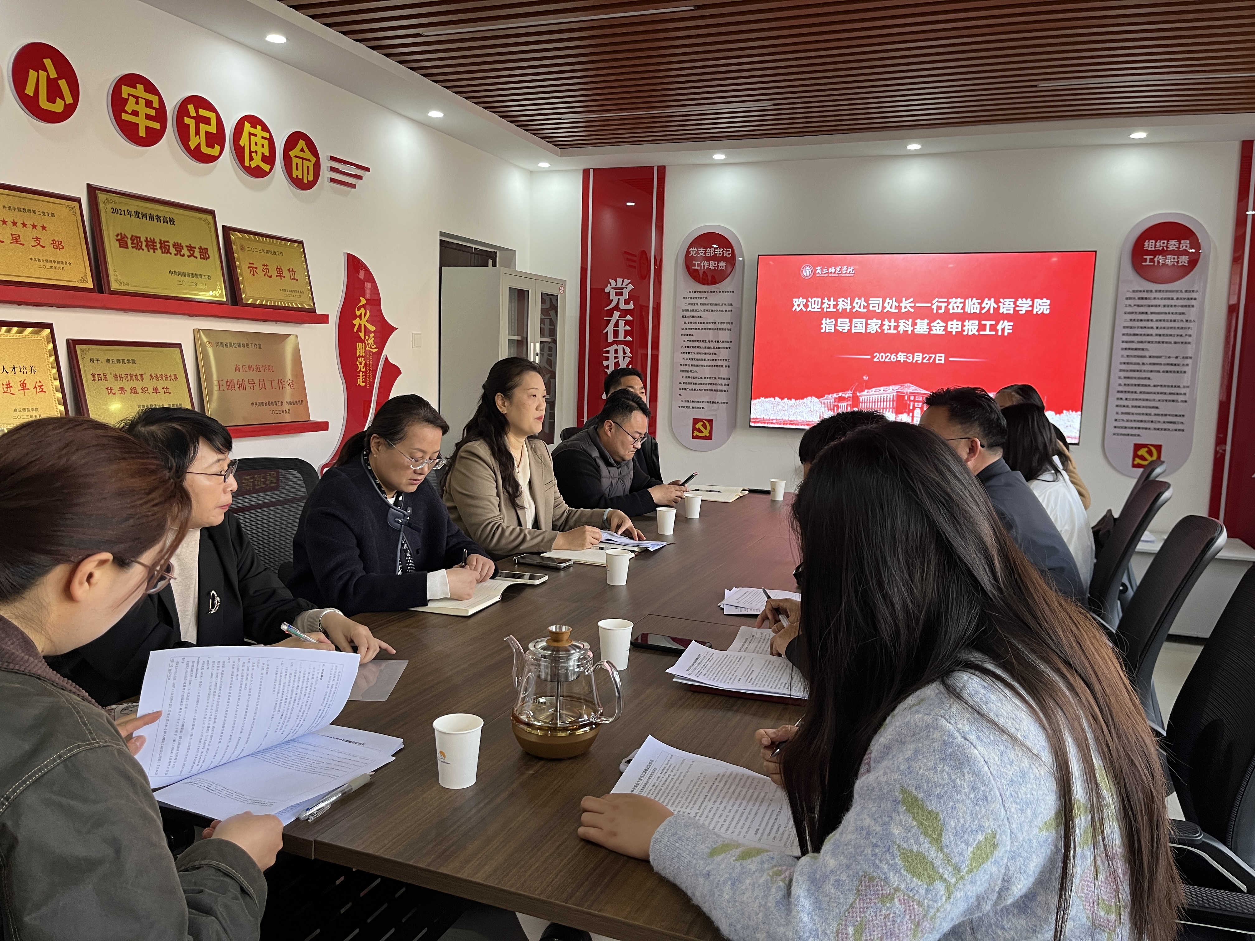 3月26日上午,学校社会科学处处长司永海、副处长郑向杰、科长孙宇一行莅临bv1946伟德指导国家社科基金项目申报工作。bv1946伟德经理杨静教授及拟申报项目教师参加会议。