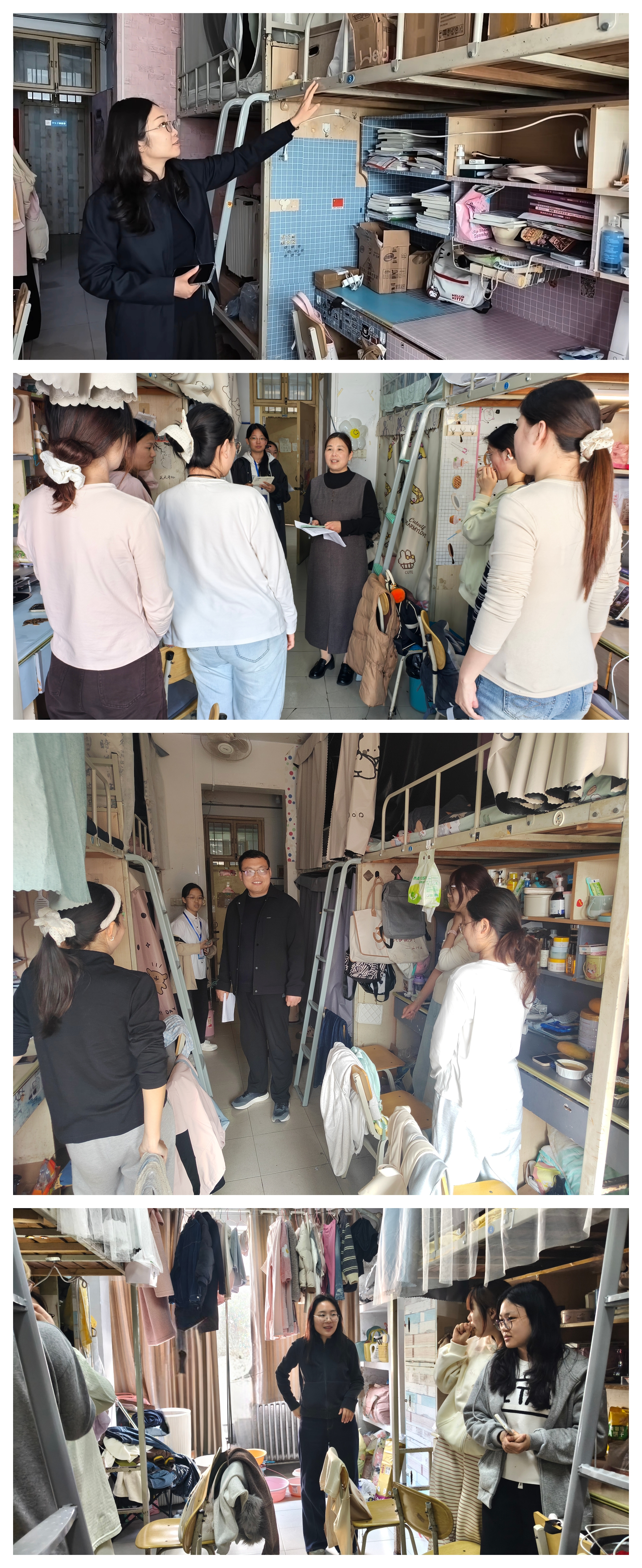 王頔一行重点对宿舍用电安全、消防安全、内务卫生等进行了检查,对违规电器、私拉电线等安全隐患逐一提醒整改,叮嘱员工要牢固树立安全意识,自觉维护宿舍公共环境和文明秩序,将“守安全、讲文明、优卫生”理念落到实处。各年级辅导员还逐一对员工清明节假期离校返乡、留校及外出行程等情况进行了调研,特别是针对“五困生”等重点群体,详细了解假期安排、生活困难与就业规划等,切实做好暖心服务,及时回应员工反映的急难愁盼问题。