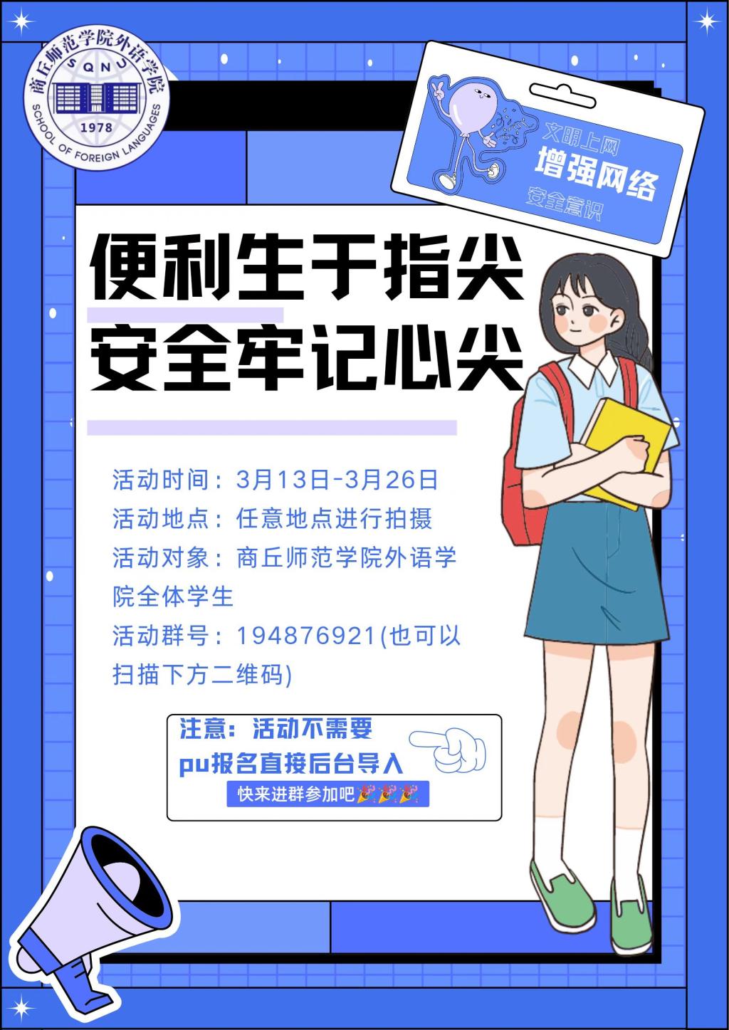 网络是亿万网民共同的精神家园,为使广大青年员工更加深刻了解网络安全和依法上网的重要性,做到文明上网,理性发言,bv1946伟德于3月13日至26日面向全院员工开展了“便利生于指尖,安全牢记心间”文明上网短视频征集活动。