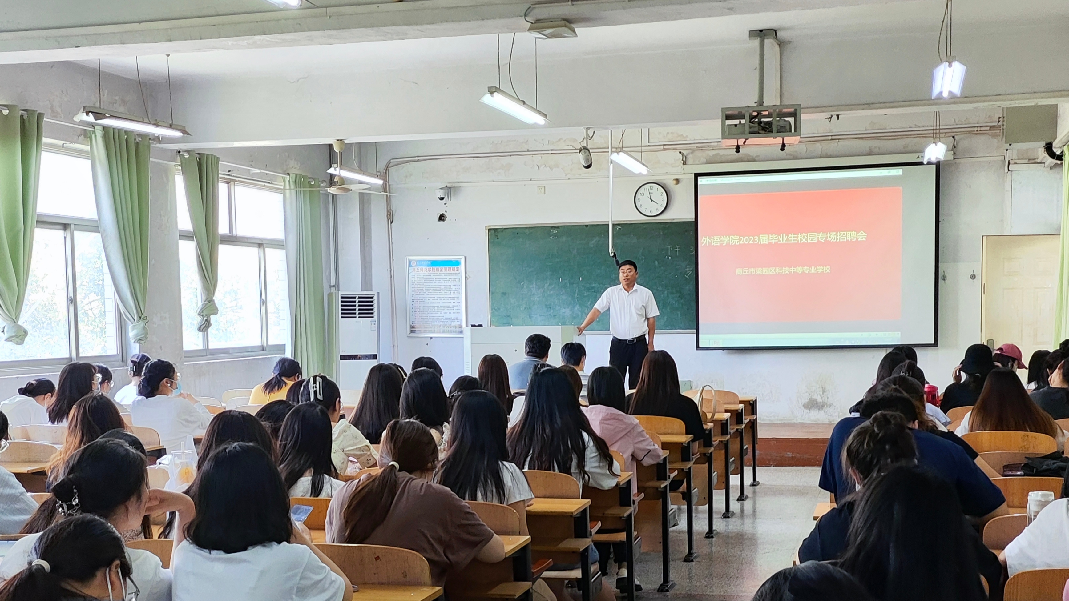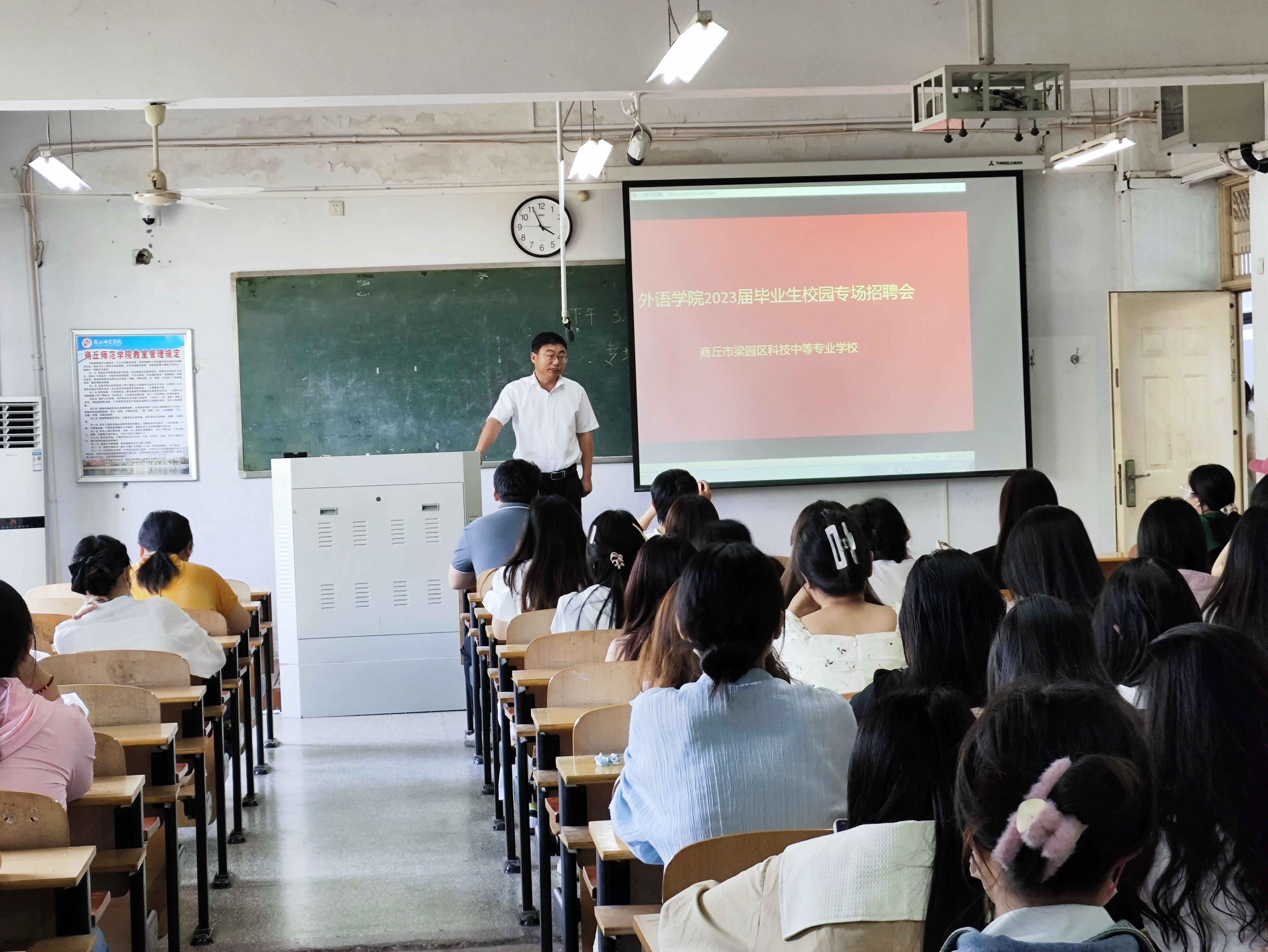 为促进2023届毕业生充分就业,提升就业服务质量,推动就业工作平稳运行。6月7日下午,bv1946伟德于梁园校区智圆楼215教室举行2023届毕业生校园专场招聘会,本次招聘会由辅导员郭继鹏老师主持,2023届英语专业毕业生100余人参加,用人单位为商丘市梁园区科技中等专业学校。
